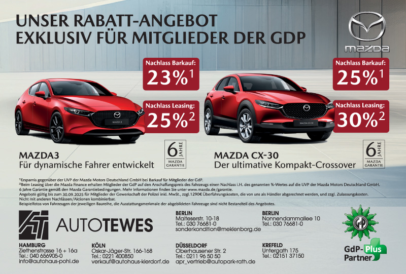 Als GdP-Plus-Partner bieten wir allen GdP-Mitgliedern Sonderkonditionen auf die gesamte Mazda-Produktpalette. Neben der 6-Jahre-Mazda-Garantie überzeugen Mazda-Modelle durch japanischer Handwerkskunst, perfektioniert für den Alltag.“
